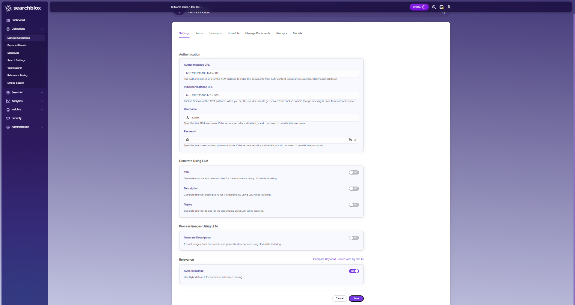 | Publisher Instance URL | URL of the AEM Publisher instance. Documents are served from the publisher, while indexing happens from the author instance. |