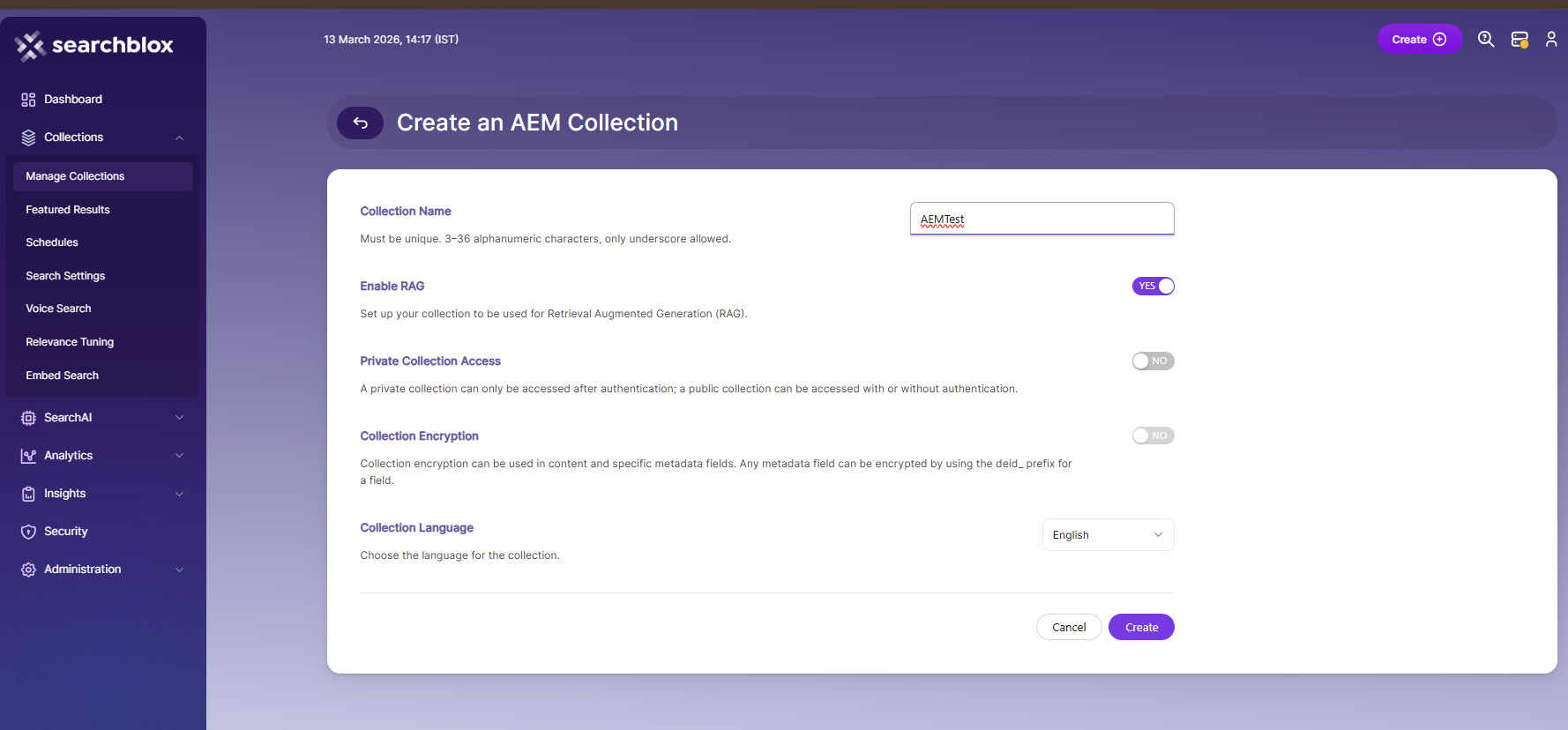 - After creating the AEM collection, you will be taken to the Settings tab.
