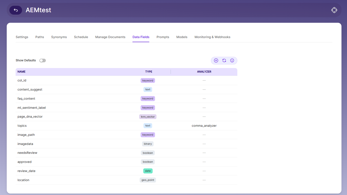 Using the Data Fields tab, you can create custom fields for search and view the default fields in non-encrypted collections. SearchBlox supports 4 types of Data Fields: