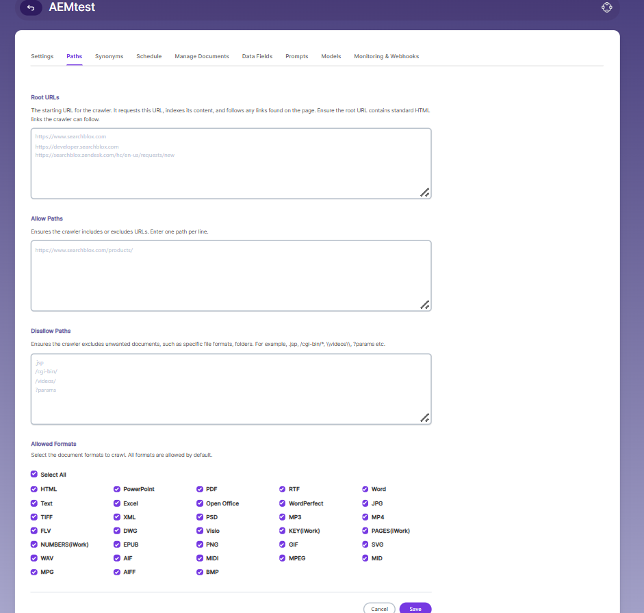 | Allowed Formats | Select the document formats to be searchable in the collection. |