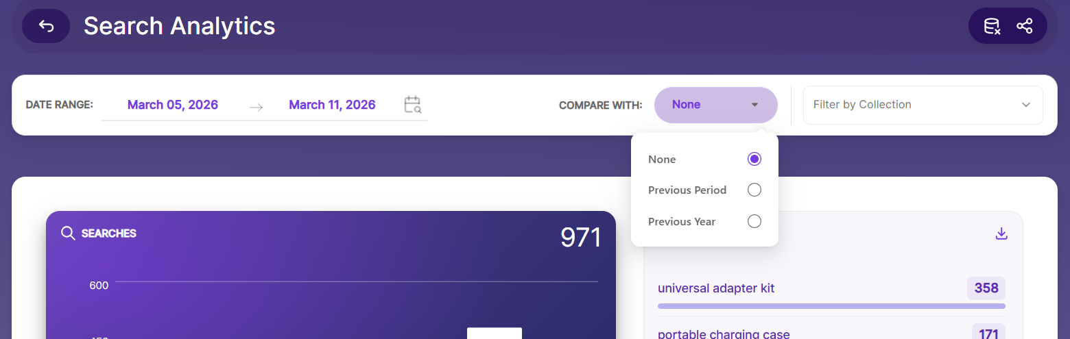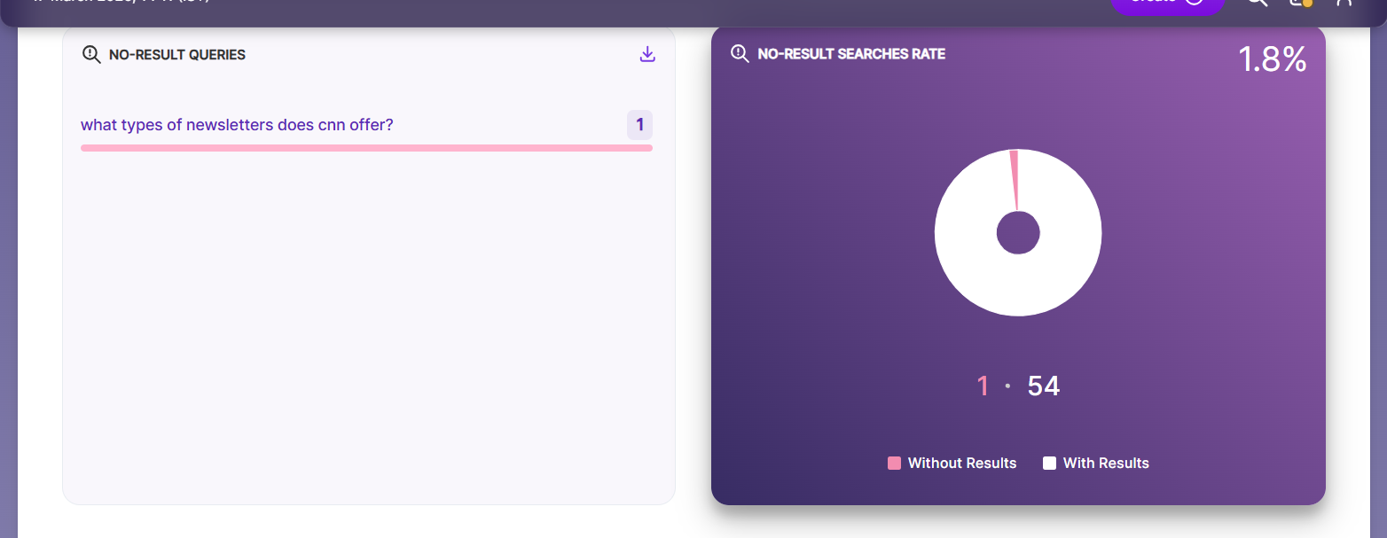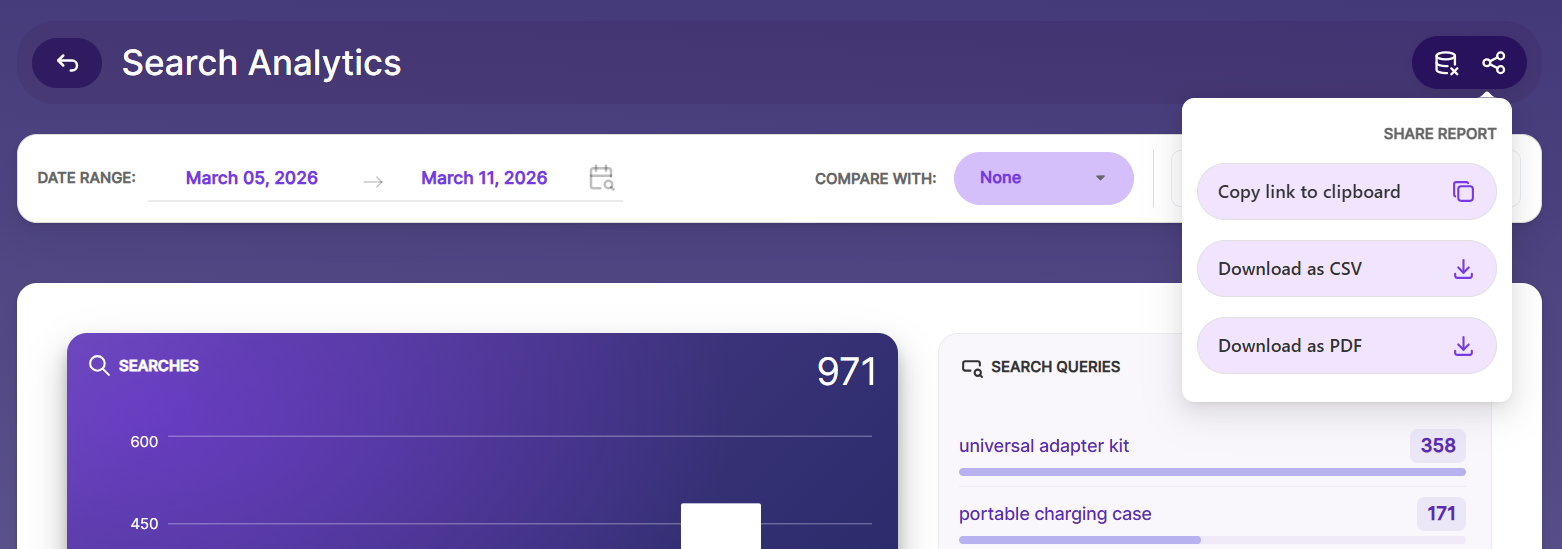 The Search Analytics section in the Admin page provides a complete report of all searches performed across every collection. You can view the data in an easy-to-read dashboard and export it as CSV or Excel files, or download it directly using a URL.