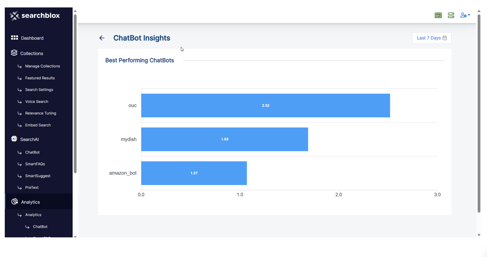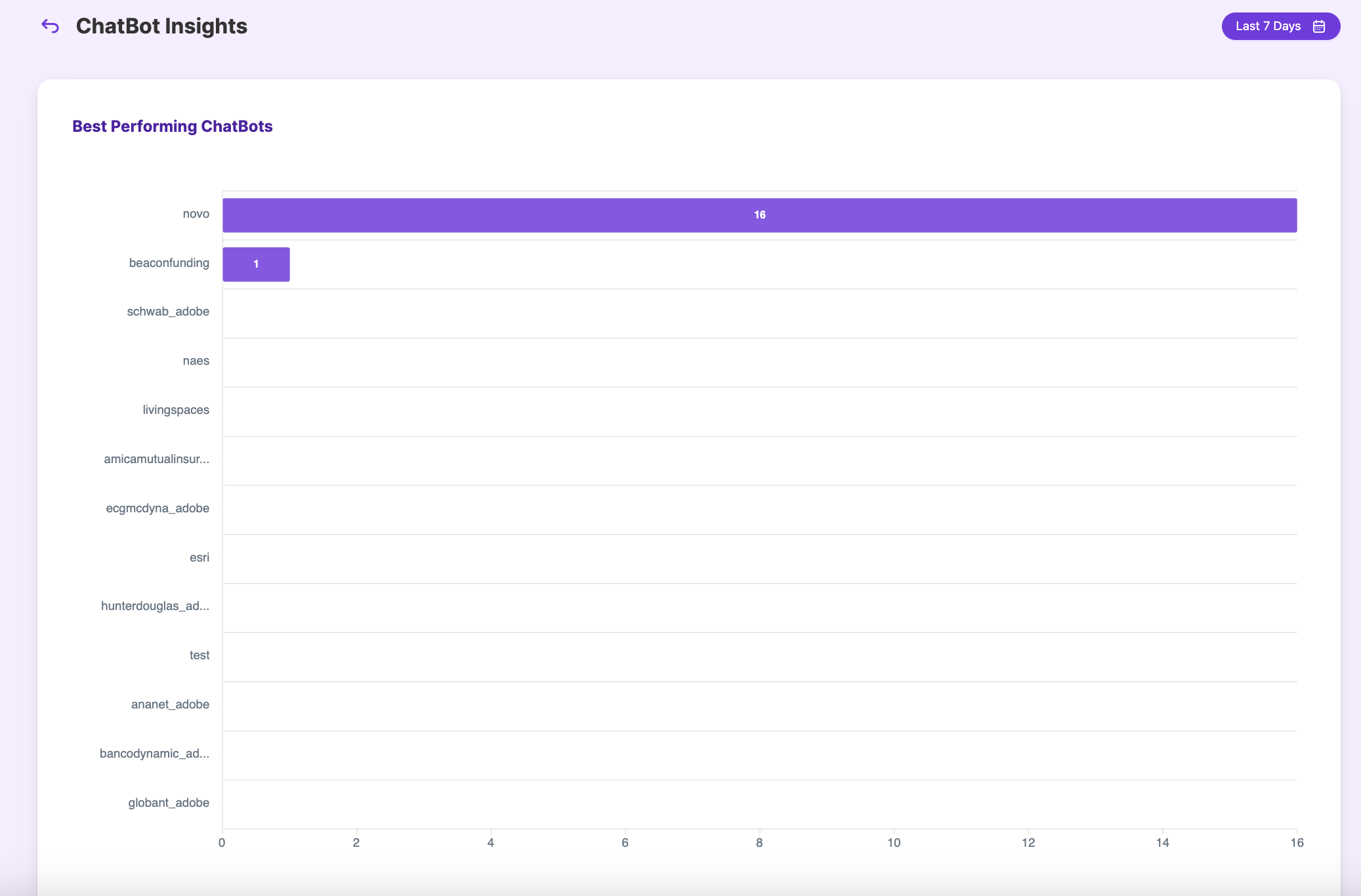 Based on ChatBot Analytics reports, the best-performing ChatBots are displayed in ChatBot Insights. You can select the time period for this view using the calendar icon in the top-right corner.
