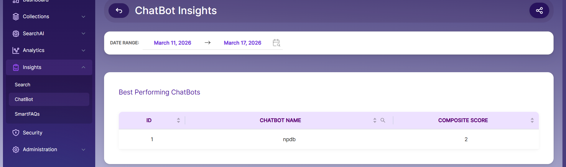 Based on ChatBot Analytics reports, the best-performing ChatBots are displayed in ChatBot Insights. You can choose the time period for this view using the calendar icon in the top-right corner.