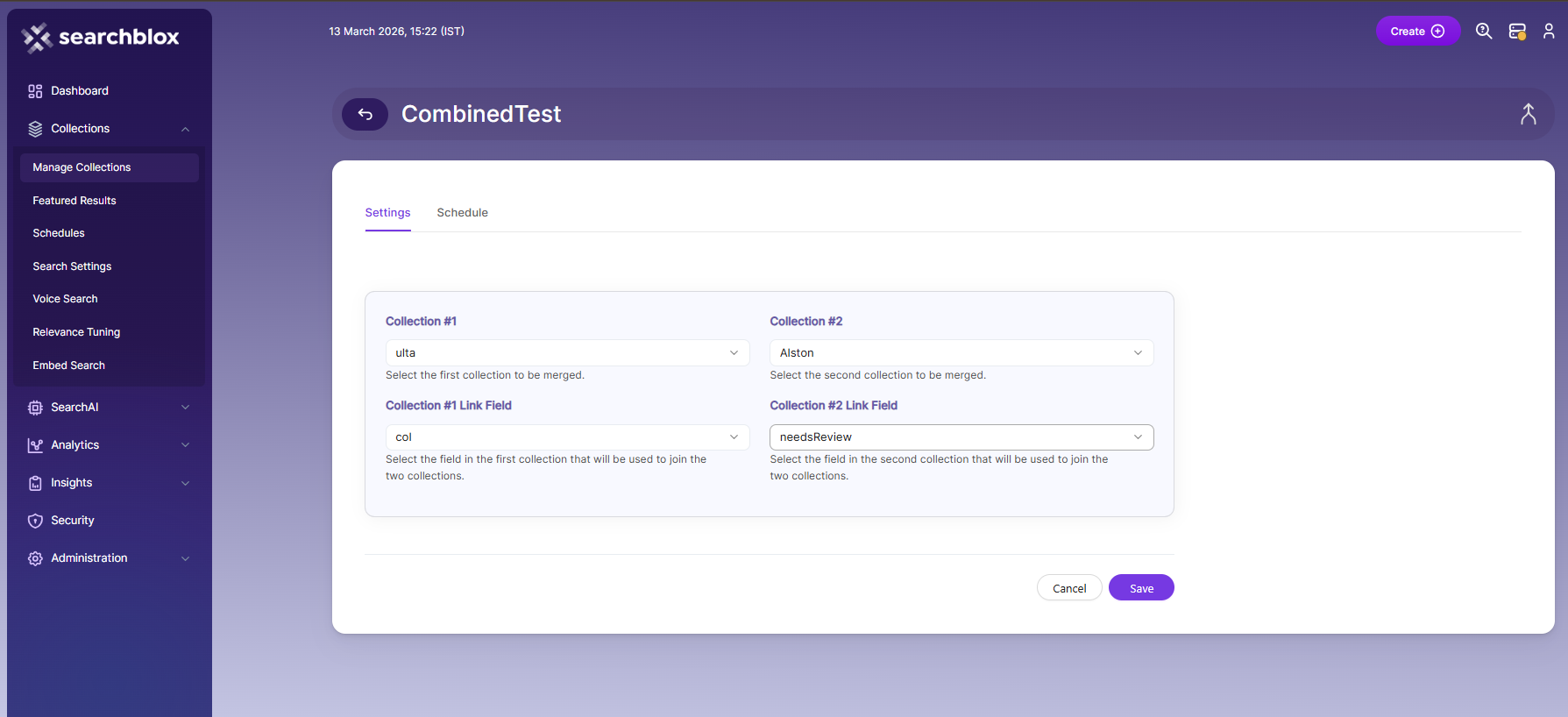 - In the Settings tab, you can combine two collections by selecting the collection type and choosing the common field to link them.