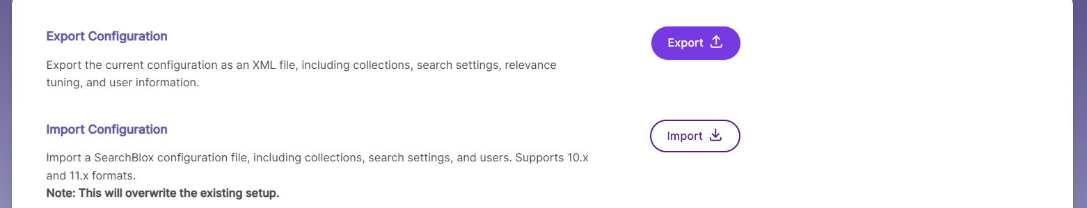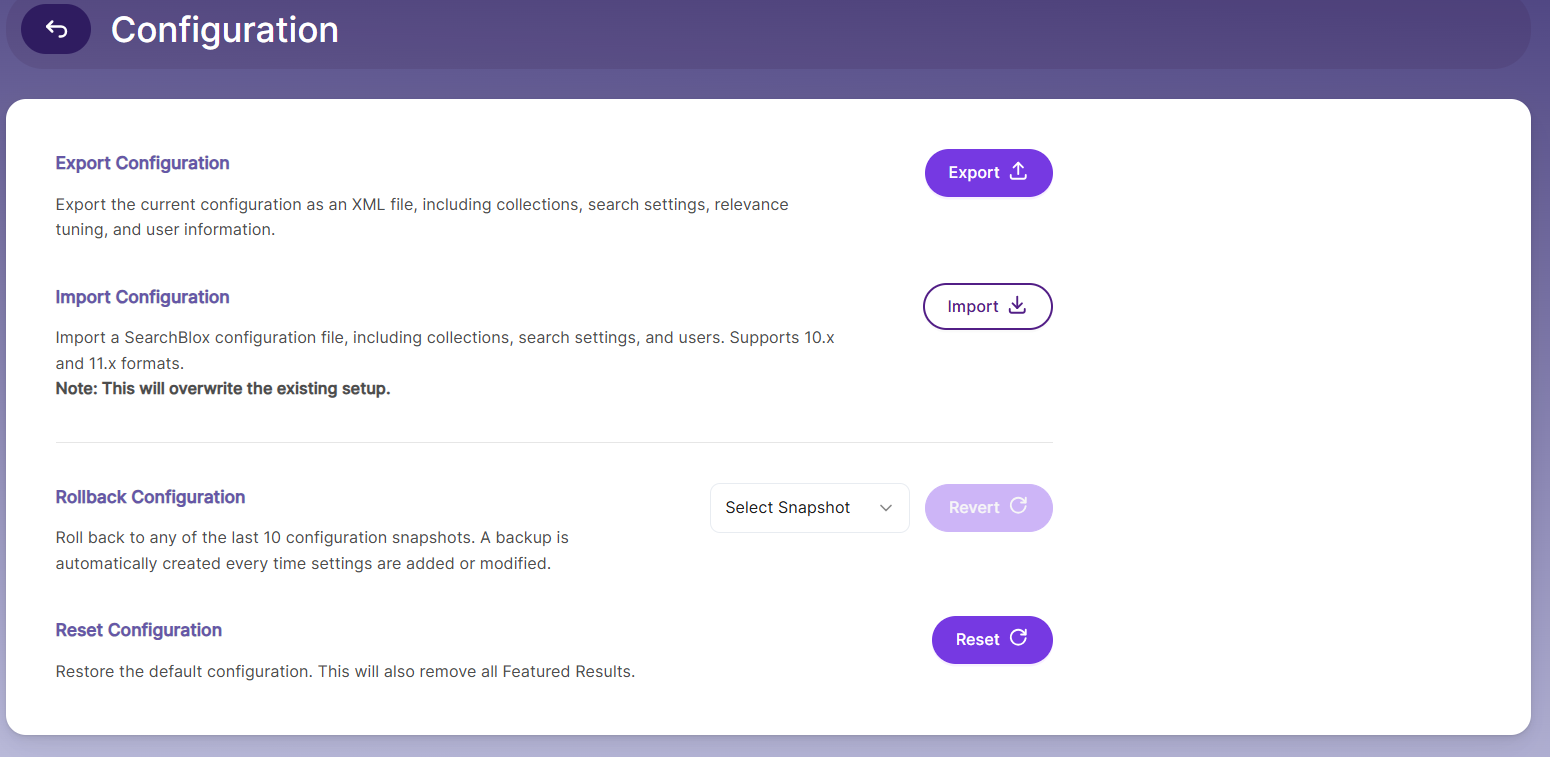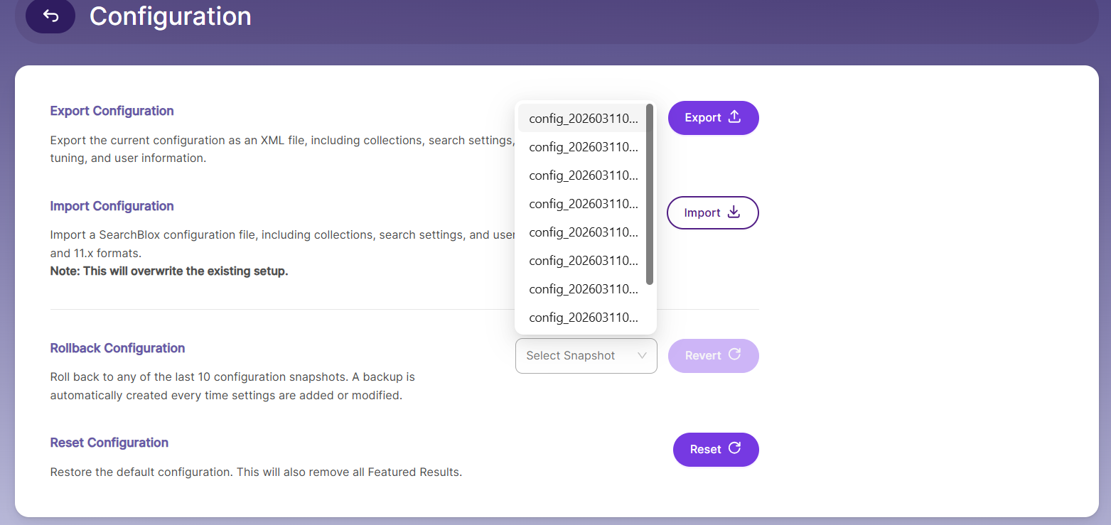 Export and Import Functionality: Configuration files can be exported or imported during initial setup, upgrades, or migrations, allowing seamless transfer of configurations between different SearchBlox servers.