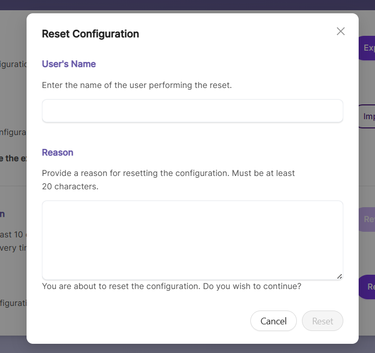 - When performing a configuration reset, the user must provide a reason, which is logged in the status.log file for reference.
