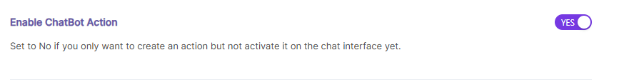 Switch this toggle to "On" to activate the action, making it available to users. Turning it off will deactivate the action.