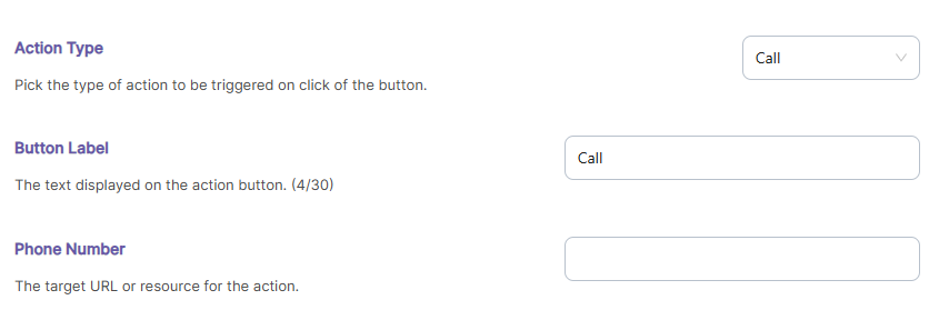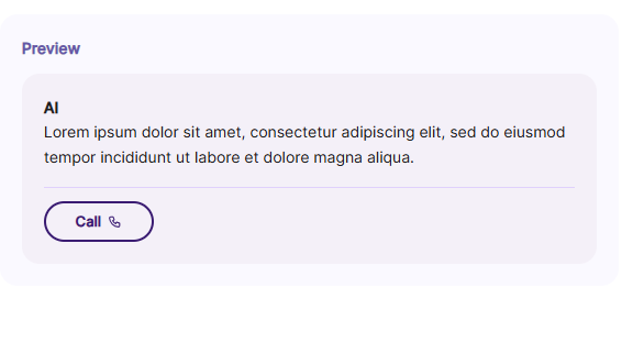 Example: To trigger an action for contacting support, you can use keywords such as “Call support,” “Speak to an agent,” “Call agent,” or “Connect to an agent.”