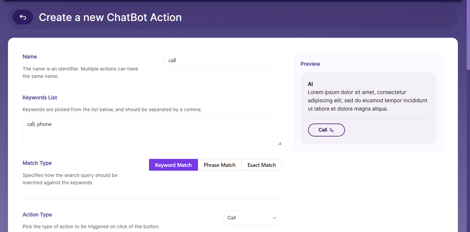 - Exact Match: The action is triggered only when the user’s input exactly matches the defined keyword or phrase, with no additional words. This is the most restrictive option and ensures the action runs only when the user’s intent is very clear.