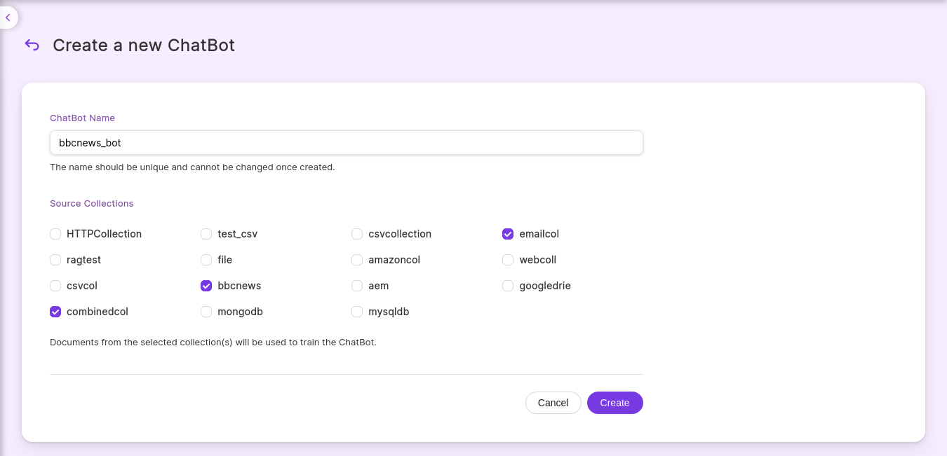 - The ChatBot will be trained using documents from the selected collections. Ensure that the collections contain relevant and sufficient data for effective training.