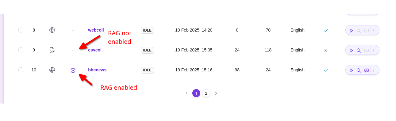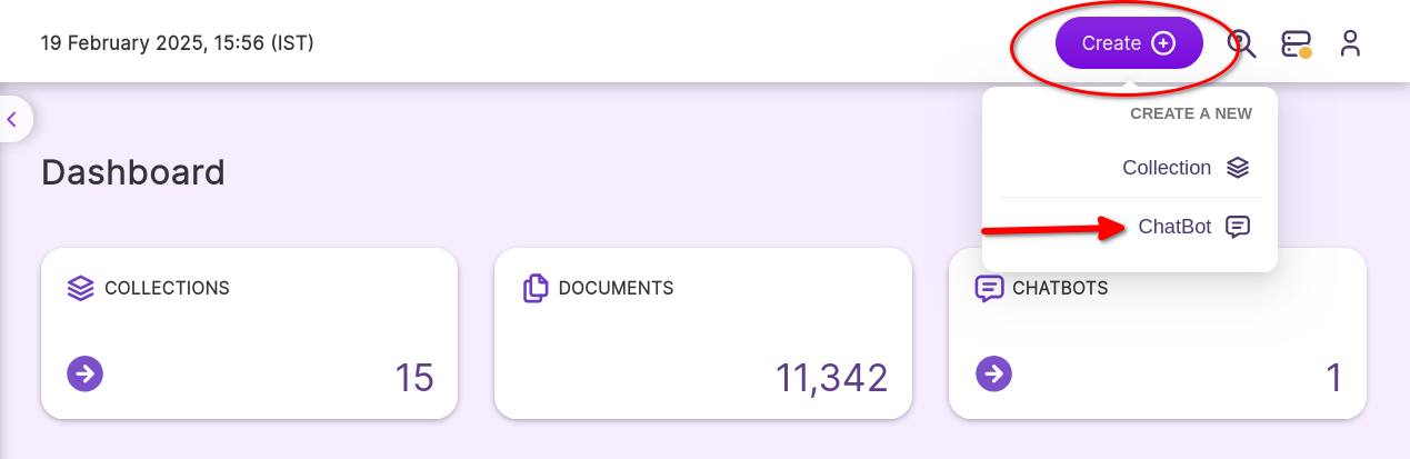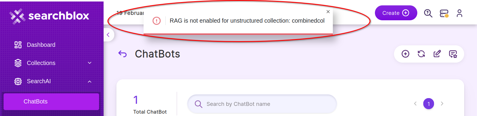 If RAG was not enabled for any of the collections selected, a popup will be displayed on the top stating it and the chatbot will not be created.