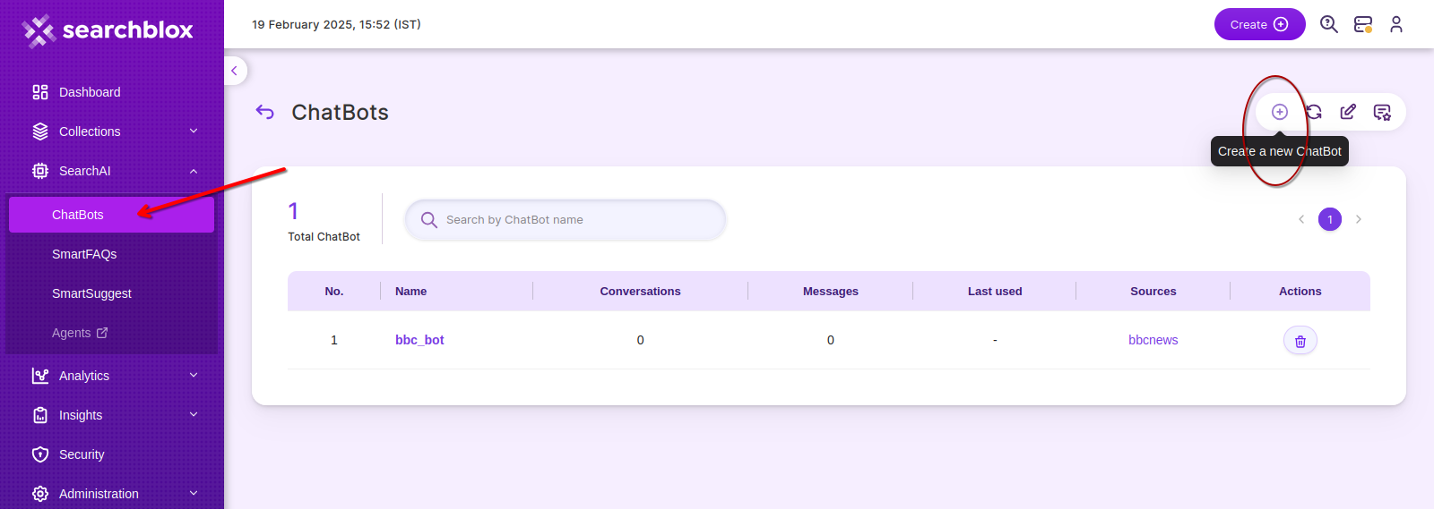 ChatBotsinterface page. Here you see a listed view of all the chatbots created.