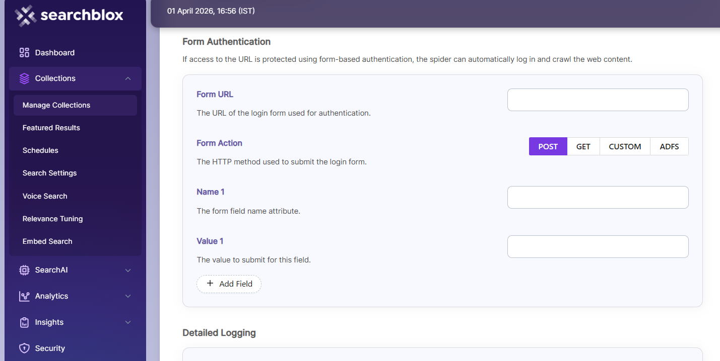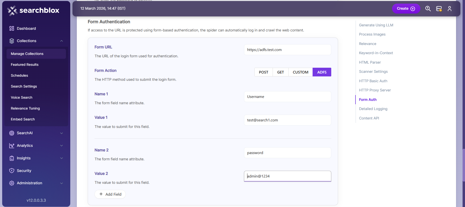 To index documents using form authentication, provide the following fields in the WEB collection settings: