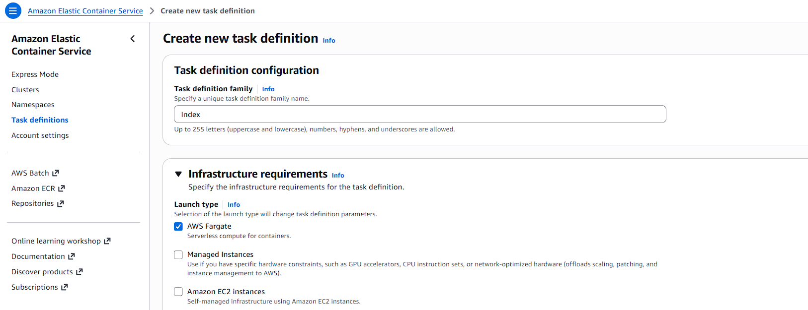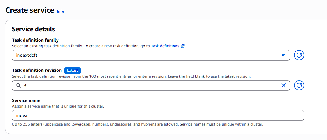 - Task Definition: Choose latest revision (Index)