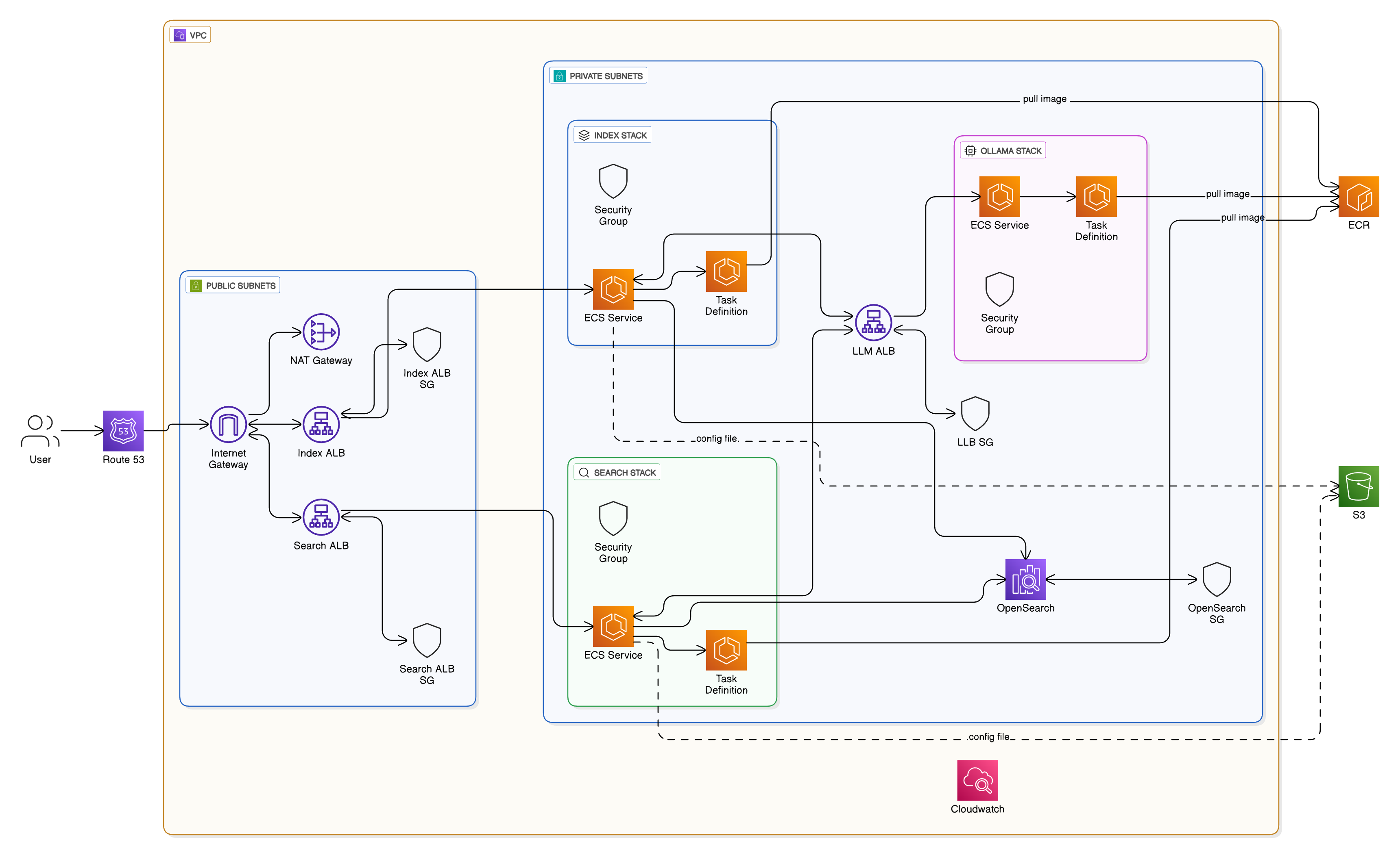 This architecture runs containerized services using Amazon ECS (Fargate) within a secure Amazon VPC. It includes Index, Search, and LLM services that process data and interact with Amazon OpenSearch Service.