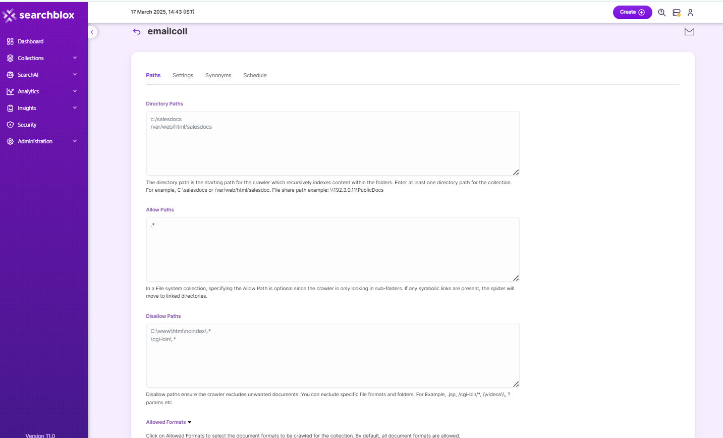 | Allow Paths | C:\\www\\html\\*When creating an email collection, specifying an allow filter is optional since the indexer is only going to look into sub-folders, but if any symbolic links are placed, the spider will move to linked directories. |