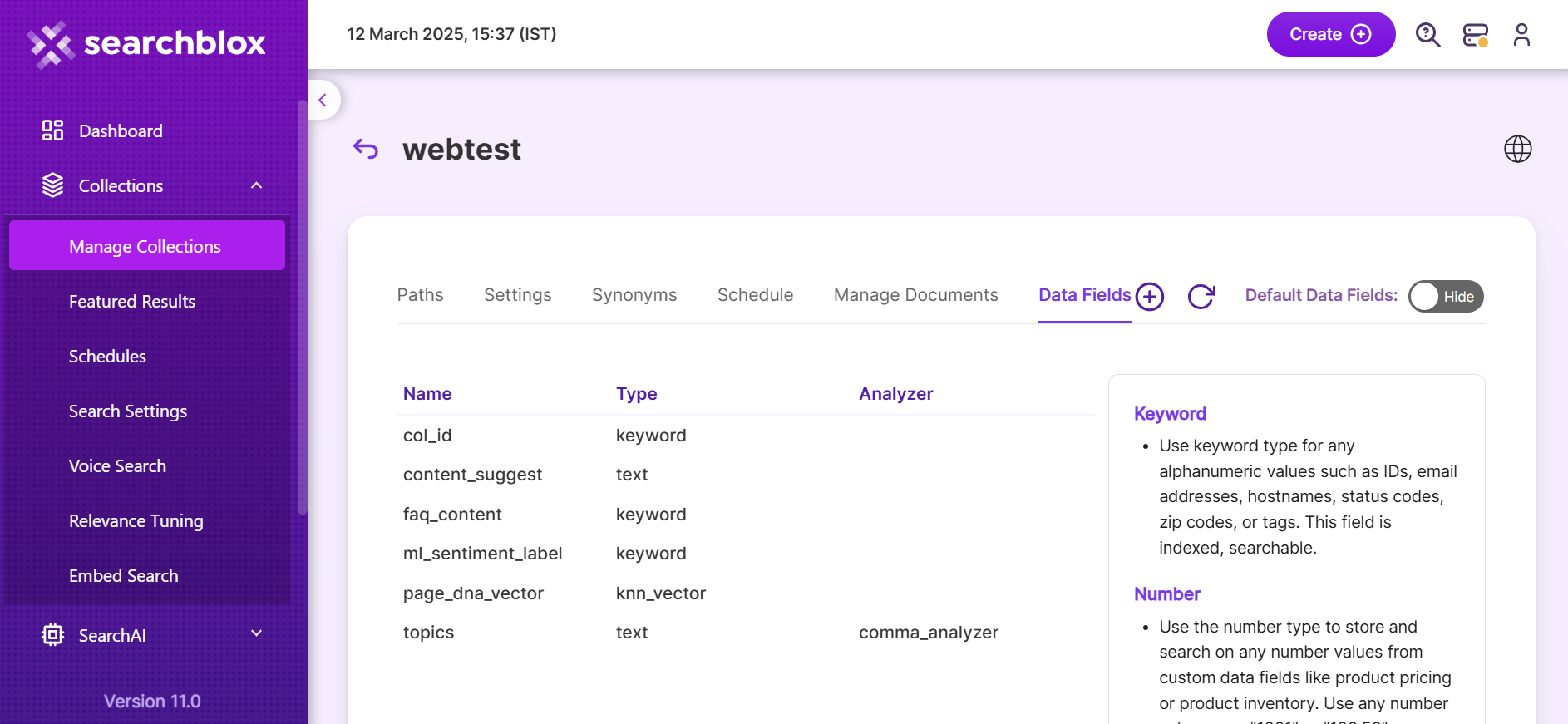 Using Data Fields tab we can create custom fields for search and we can see the Default Data Fields with non-encrypted collection. SearchBlox supports 4 types of Data Fields as listed below:
