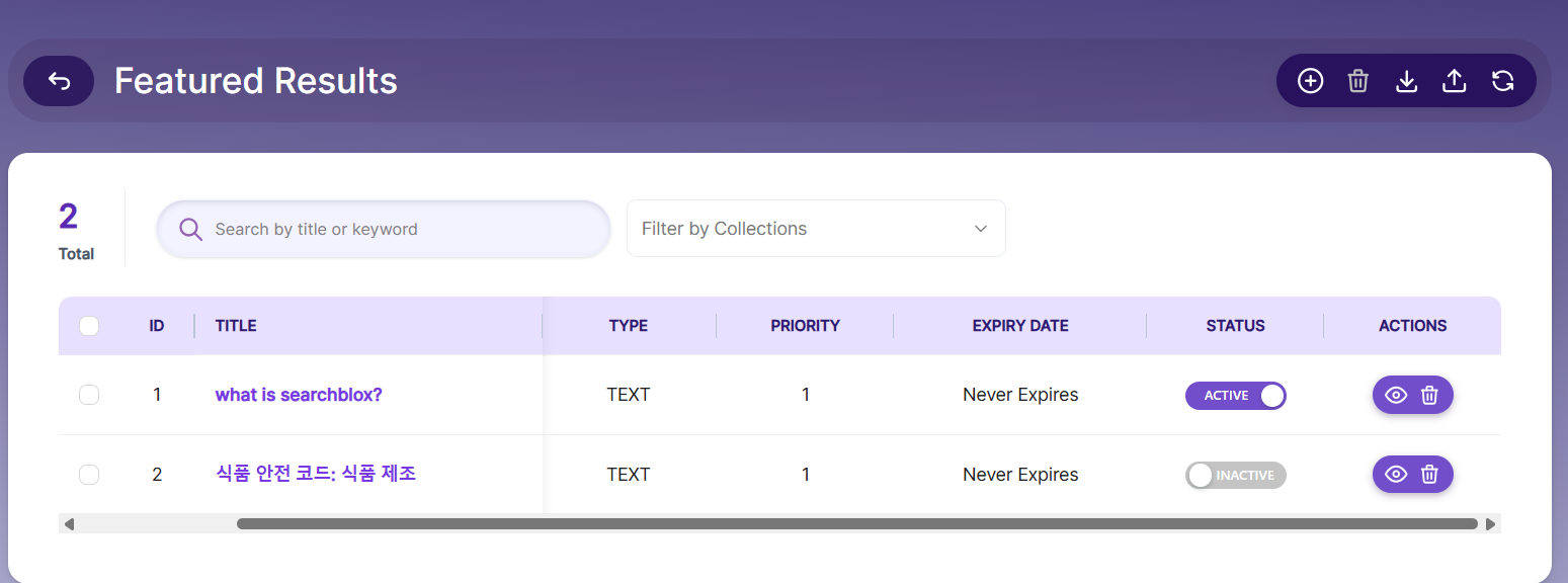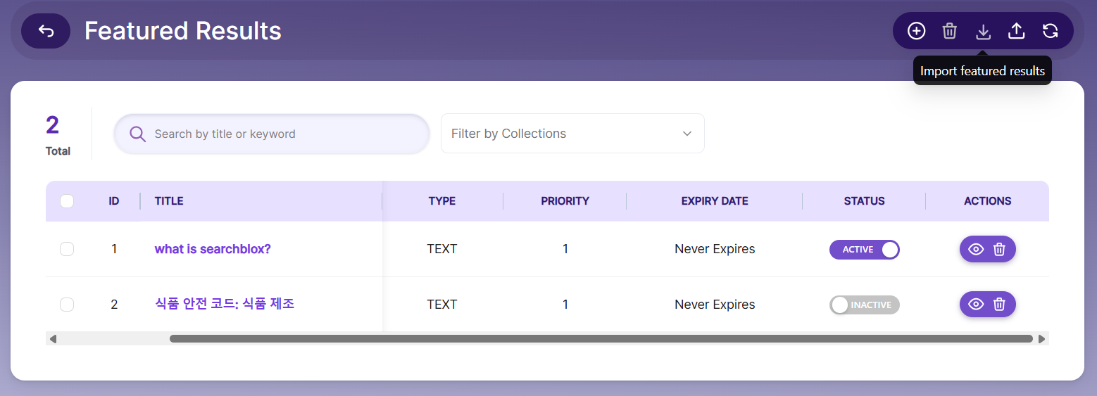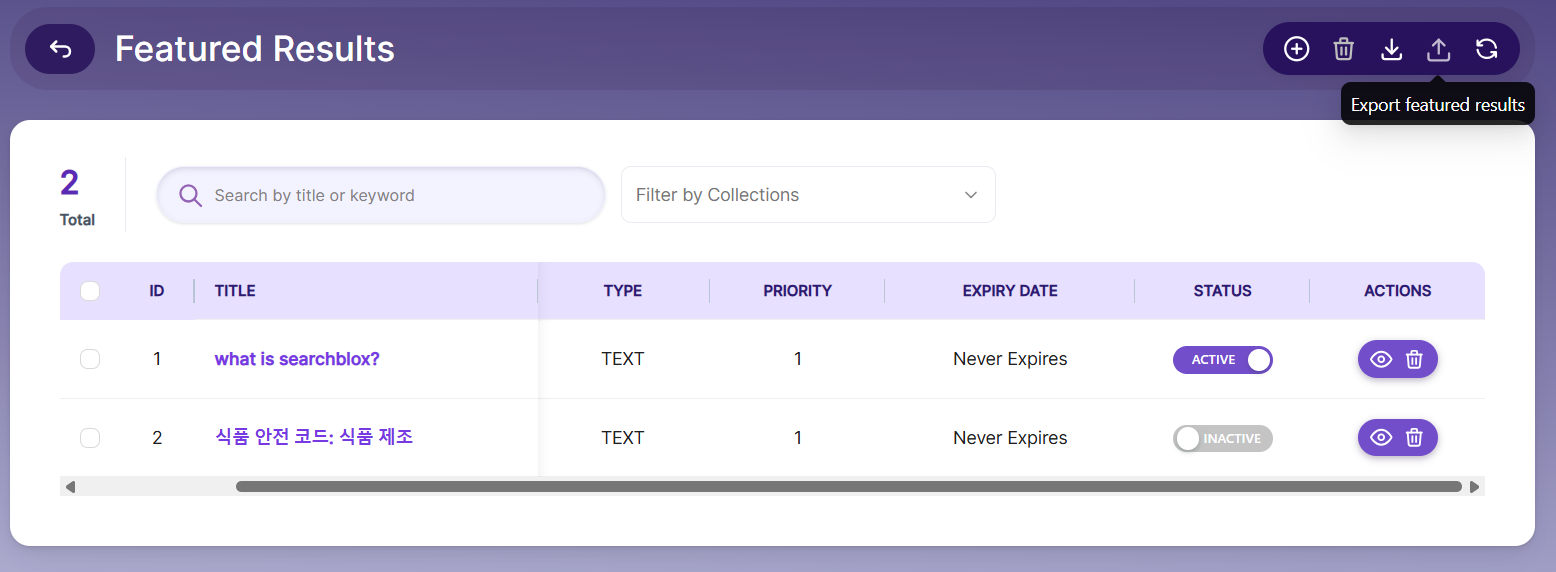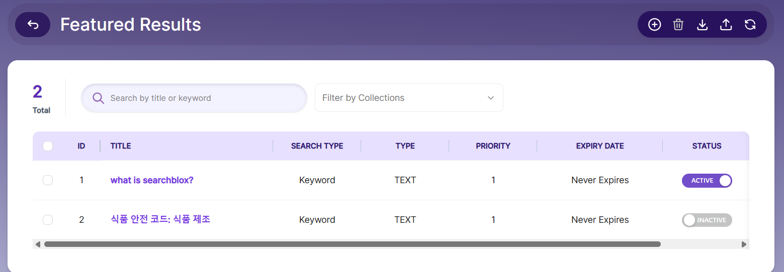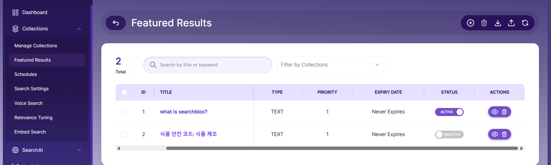 Filter Featured Results: Quickly find specific results by filtering based on Collection, Title, or Keywords.
