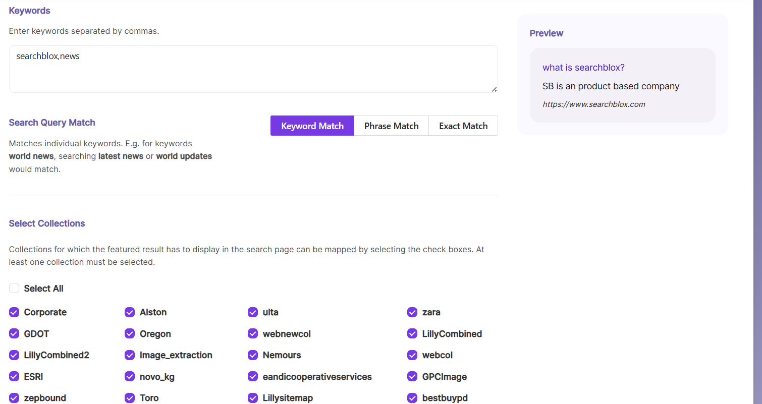 Preview Created Featured Results: Check how a Featured Result will appear on the search page before using it.