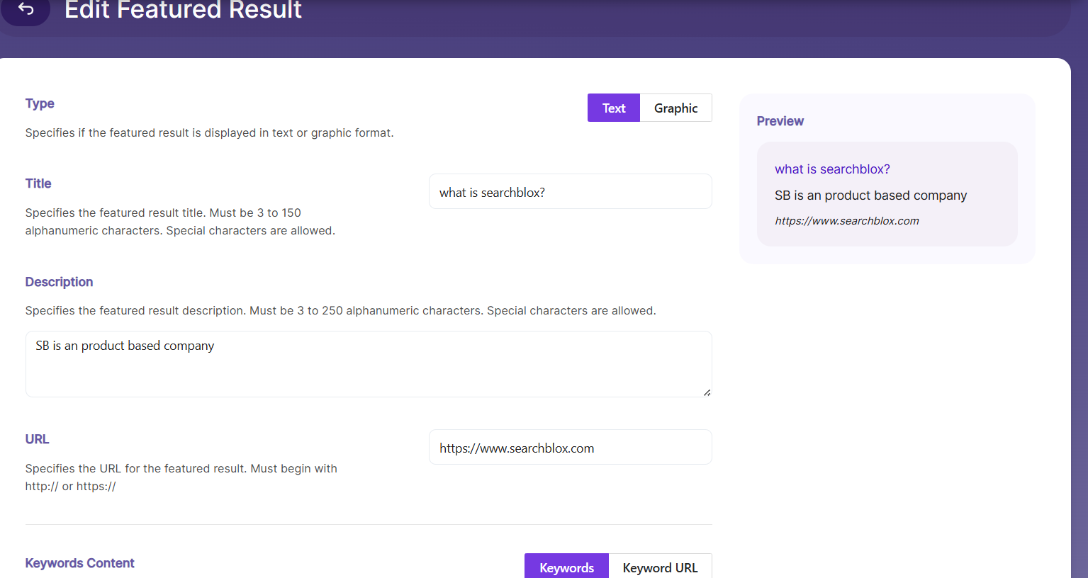 | Type | Choose if the Featured Result will be text-based or graphics-based. |