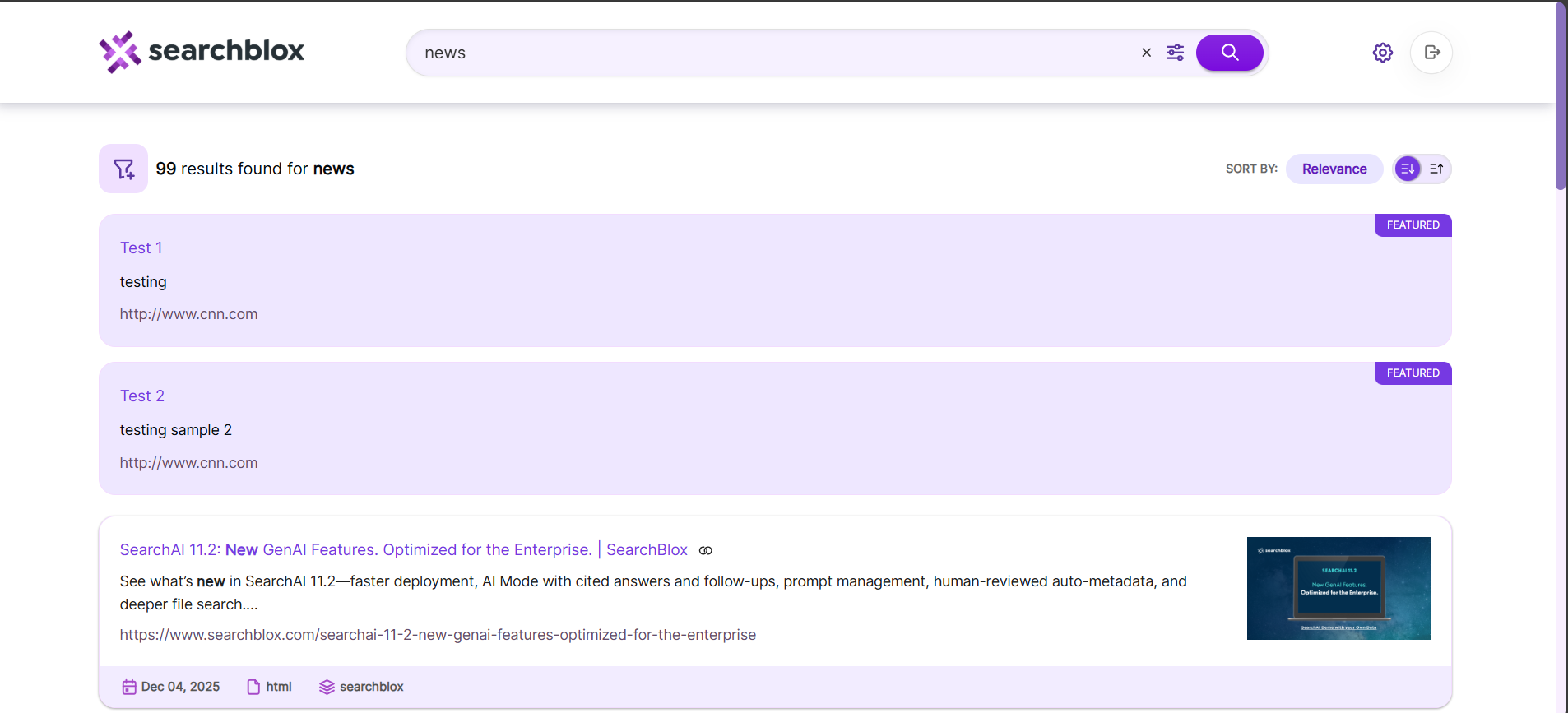 You can easily create and manage Featured Results from the SearchBlox Dashboard. Go to Dashboard → Collections → Featured Results to set up and customize this feature based on your needs.