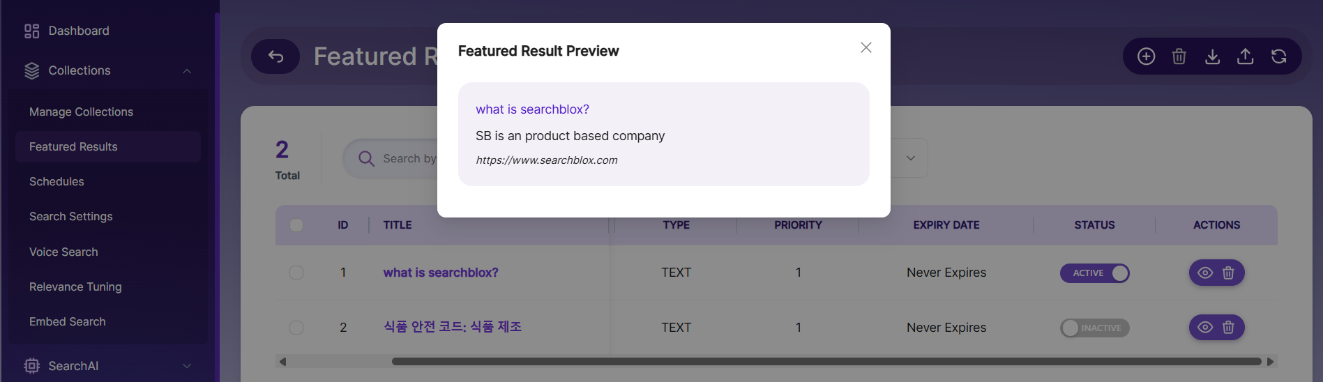 - Featured Results can be managed from the Dashboard, where you can preview how they appear on the search page and deactivate them anytime without deleting.