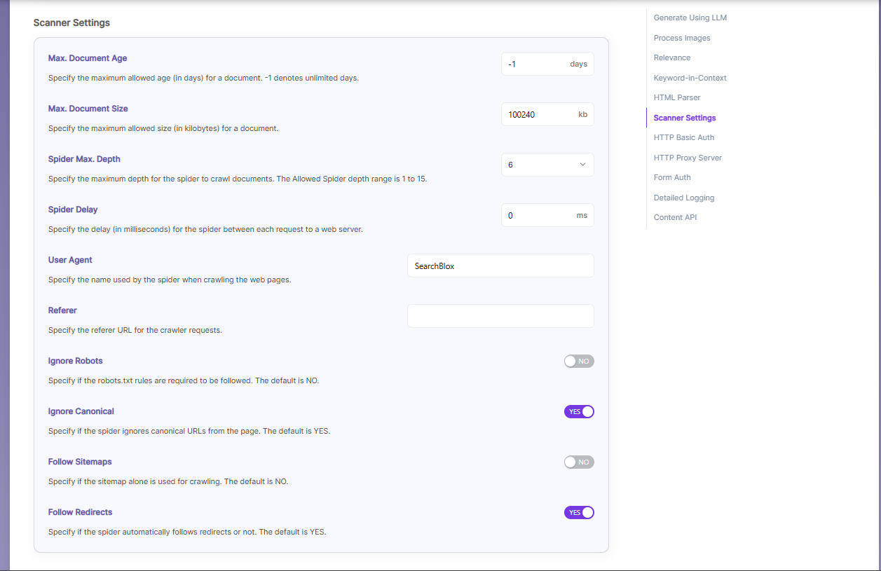 | Scanner Settings | Follow Sitemaps | Yes/No — whether to index URLs from sitemaps only or all URLs. Default is No |
