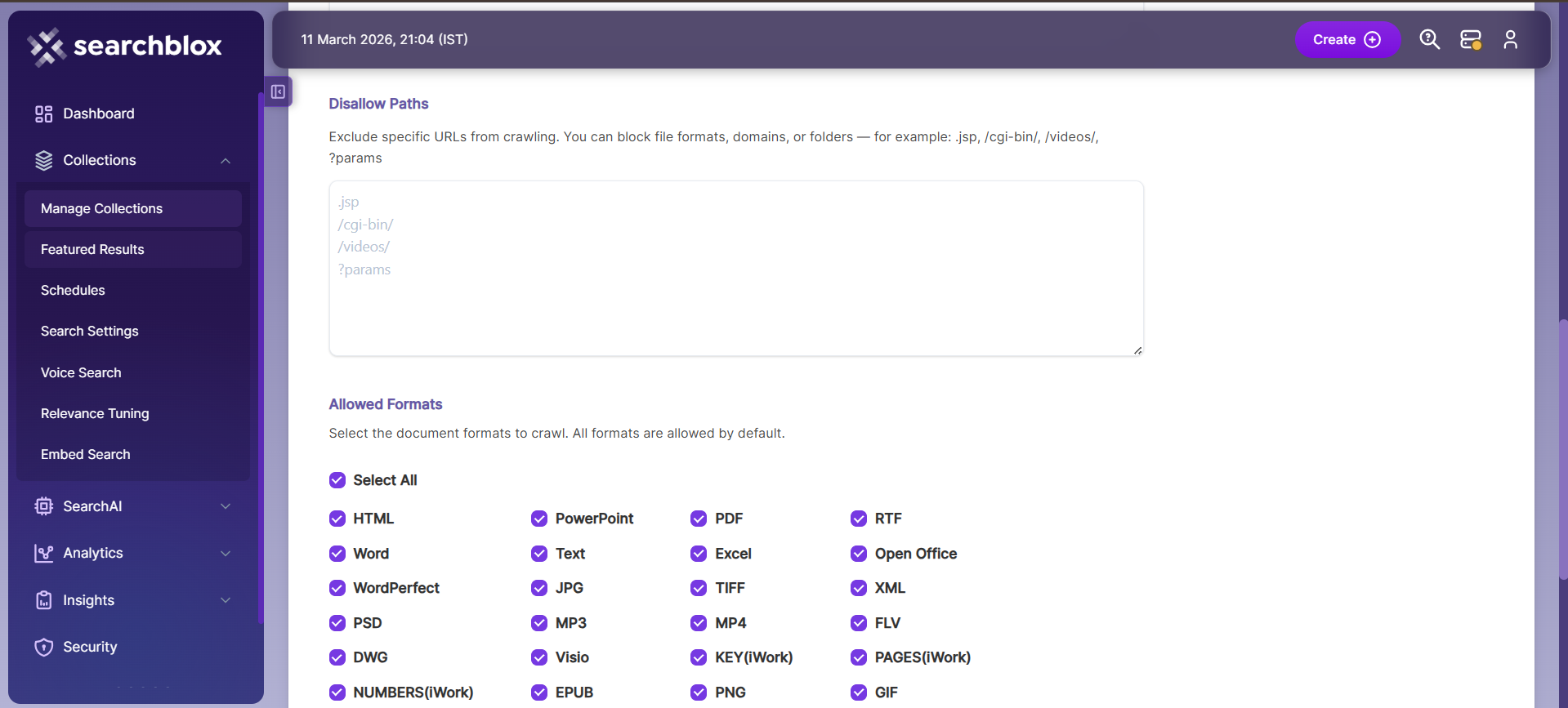 | Allowed Formats | Select the document formats that need to be searchable within the collection. |