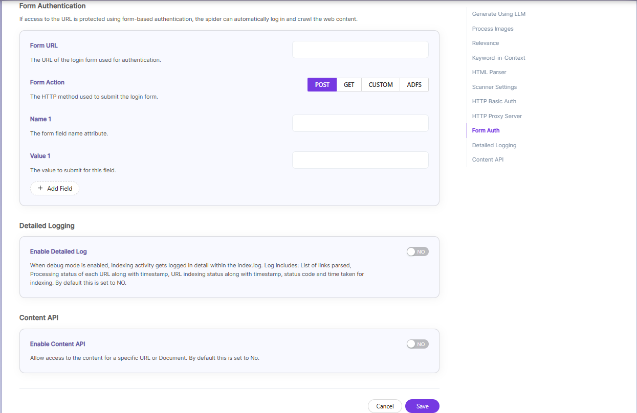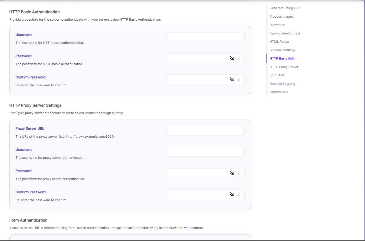 | Form Authentication | Form authentication fields | When documents are protected by form-based login, the spider can log in automatically to access them. For this, you need to provide the Form URL, the Form Action, and the required Name–Value pairs used in the login form. |