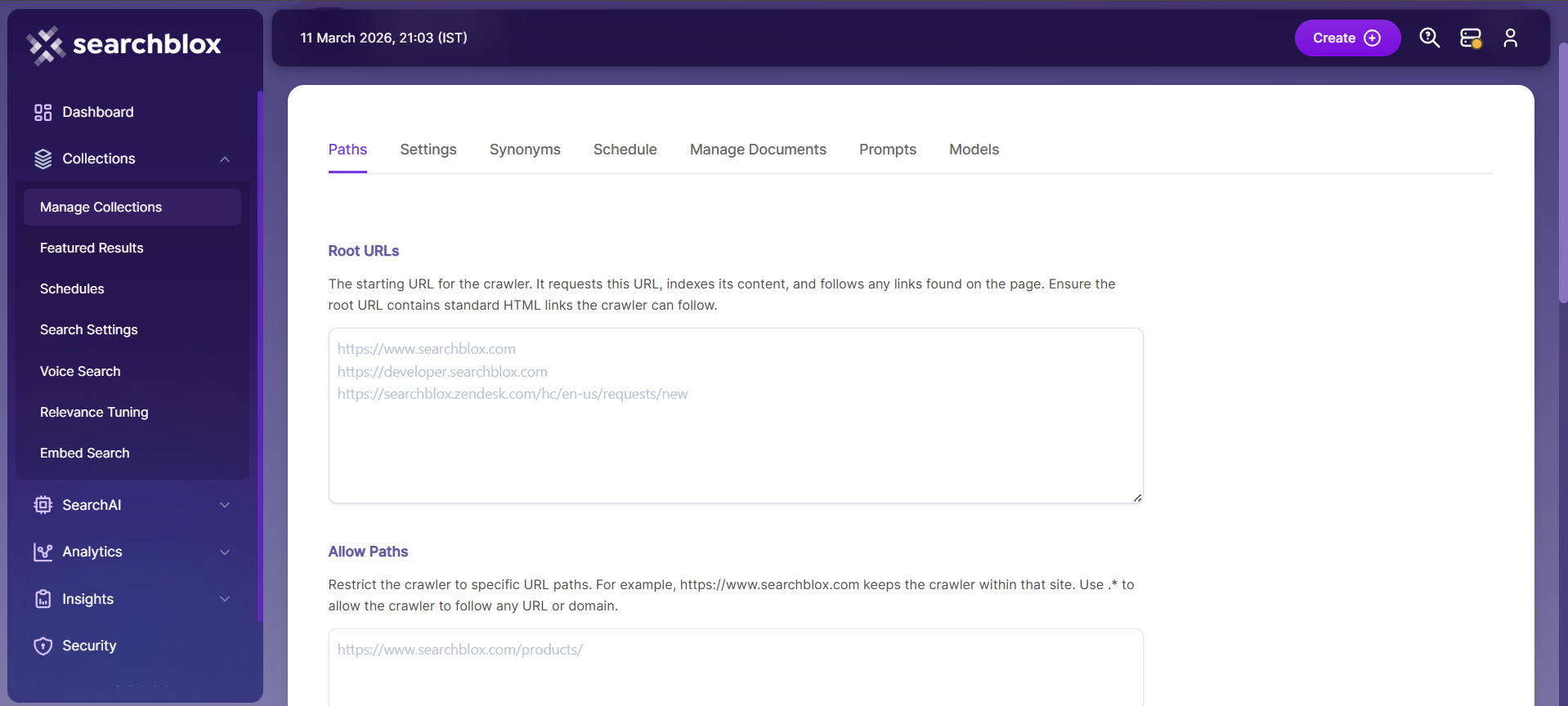 - Enter the Root URL domain name(s) (for example cnn.com or nytimes.com) within the Allow Paths to ensure the crawler stays within the required domains.