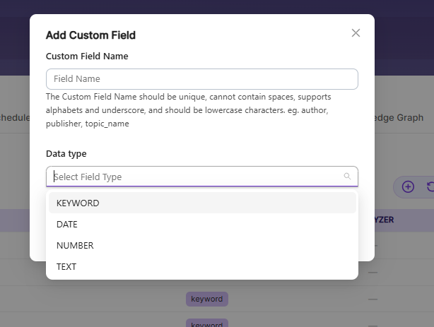 | Data Type | Data type can be keyword, text, number and date depending on the data field values. _ Keyword Use the keyword type for alphanumeric values like IDs, email addresses, hostnames, status codes, zip codes, or tags. This field is indexed and searchable. _ Number Use the number type to store numeric values from custom fields, such as product prices or inventory counts. Examples: "1001" or "100.50"._ Date Use the date type for custom date values. These dates are indexed, searchable, and can be used as facet filters. Examples: "2015-01-01" or "2015/01/01 12:10:30"._ Text Use the text type for full-text search in custom fields, like page authors or product metadata. This field is indexed, searchable, and can also be used for facet filters. |