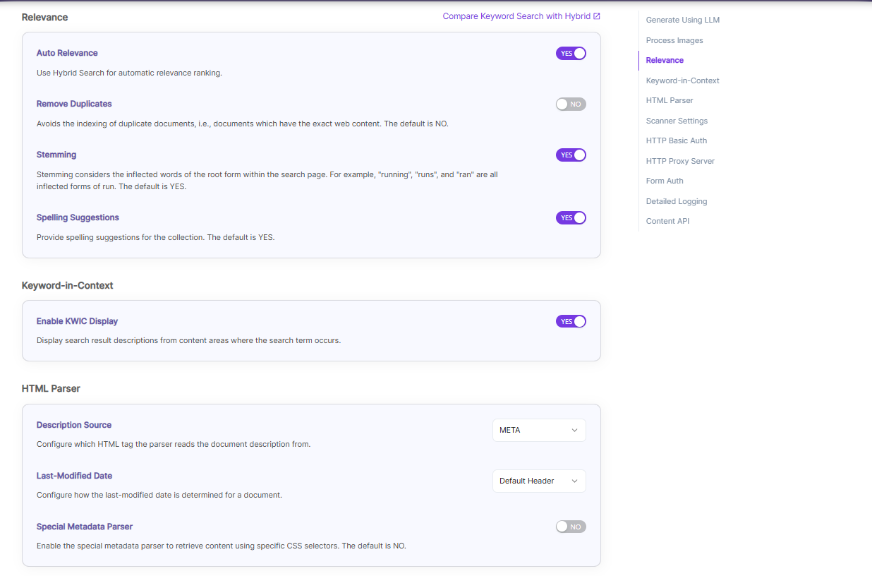 | Relevance | Remove Duplicates | Enable to prevent indexing duplicate documents. |
