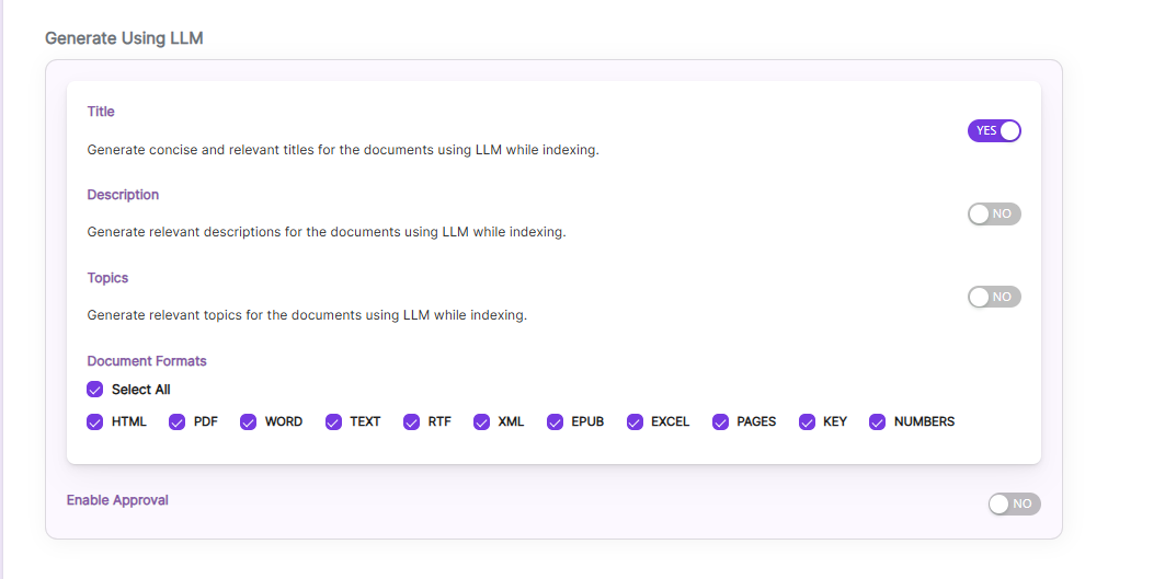 Once you Enable Title/Description/Topics, we can choose Document Formats on which we ca generate it and also Enable Approval Option as shown.