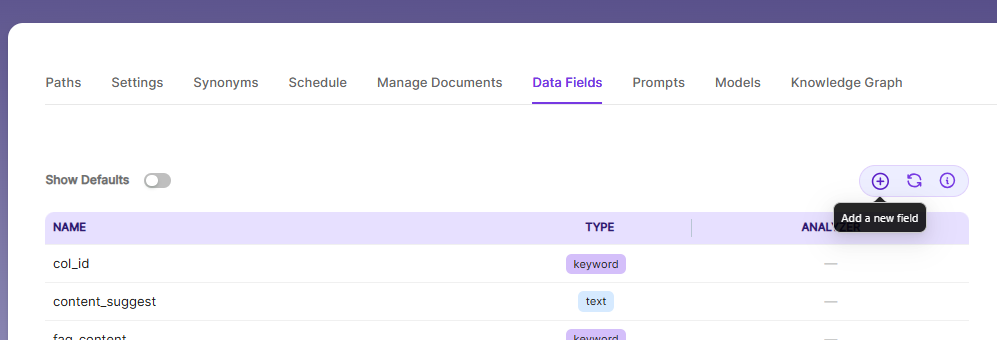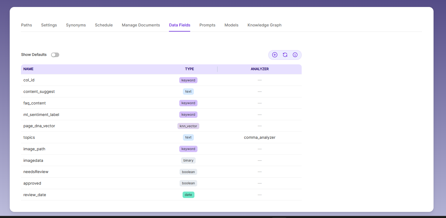 - When Default Data Fields are enabled, you will see SearchBlox’s built-in reserved fields. These reserved field names cannot be used for creating custom Data Fields.