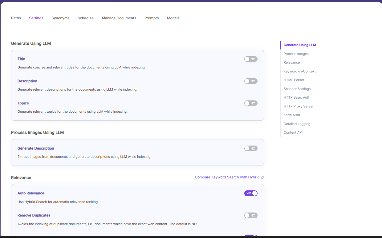 Settings Description Title Generates concise and relevant titles for the indexed documents using LLM. Description Generates the description for indexed documents using LLM. Topic Generates relevant topics for indexed documents using LLM based on document's content. Auto Relevance Enable/Disable Hybrid Search for automatic relevance ranking