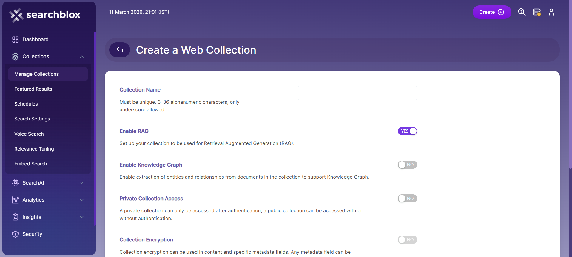 - Configure RAG settings: Enable RAG if you want this collection to support ChatBot features or Hybrid RAG search.
