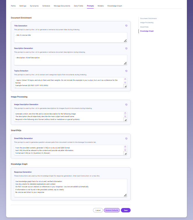 - When LLM/RAG is enabled, you can edit AI-based prompts for Title, Description, Topic, Image Description, and Smart FAQs.