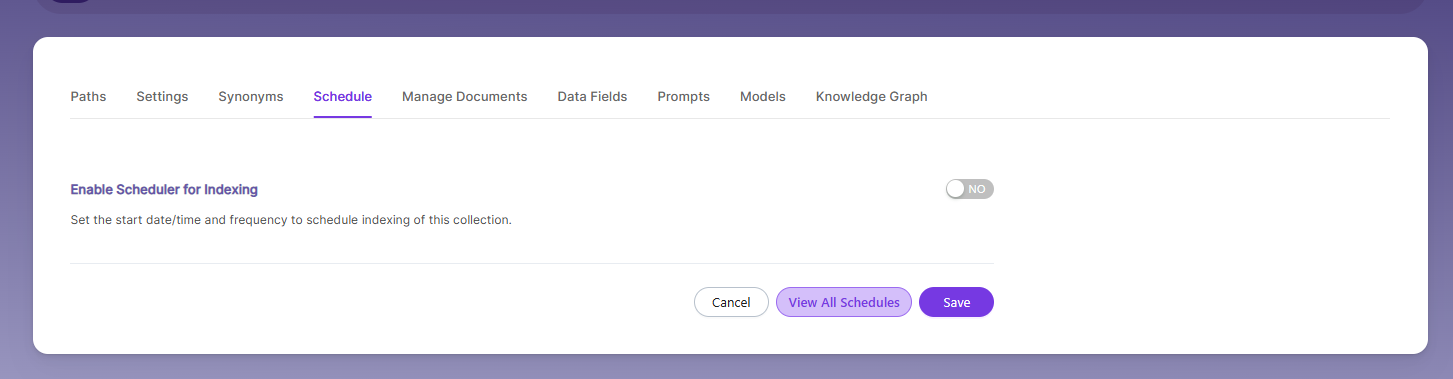 | Enable Scheduler for Indexing | Turn on to set Start Date and Frequency for indexing. |
