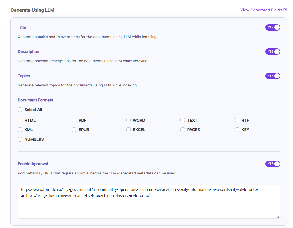 Enable Approval, if some URL needs user approval to generate Title/Descriptions/Topics. Enable and provide URLs which needs approval of a user.