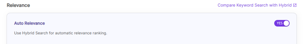 | Relevance | Auto Relevance | Turn Hybrid Search on/off to rank search results automatically by relevance. |