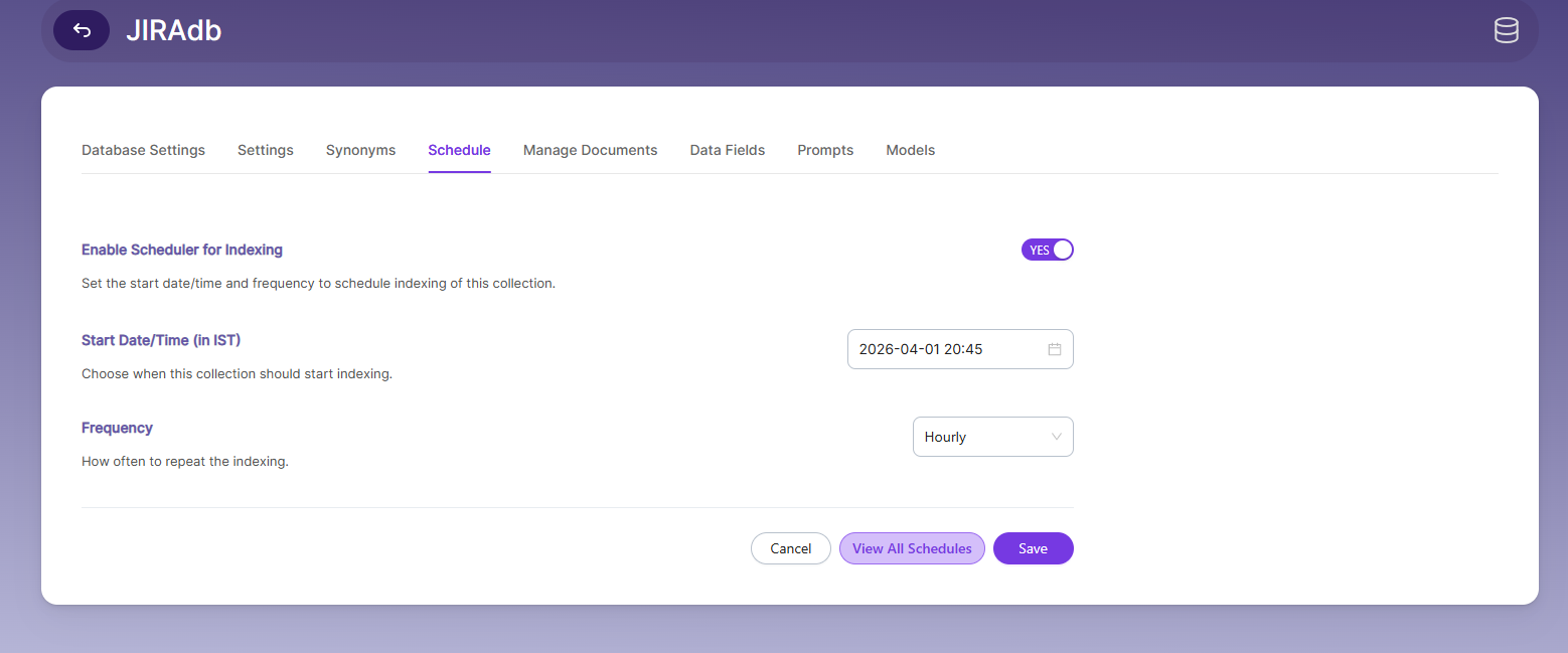 Schedule indexing either from the Schedule tab or from the Manage Collection page.