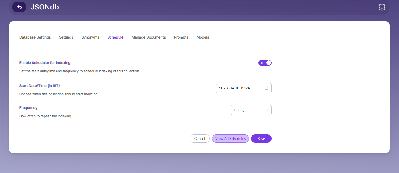 | Schedule | For each collection, indexing can be scheduled based on the above options. |