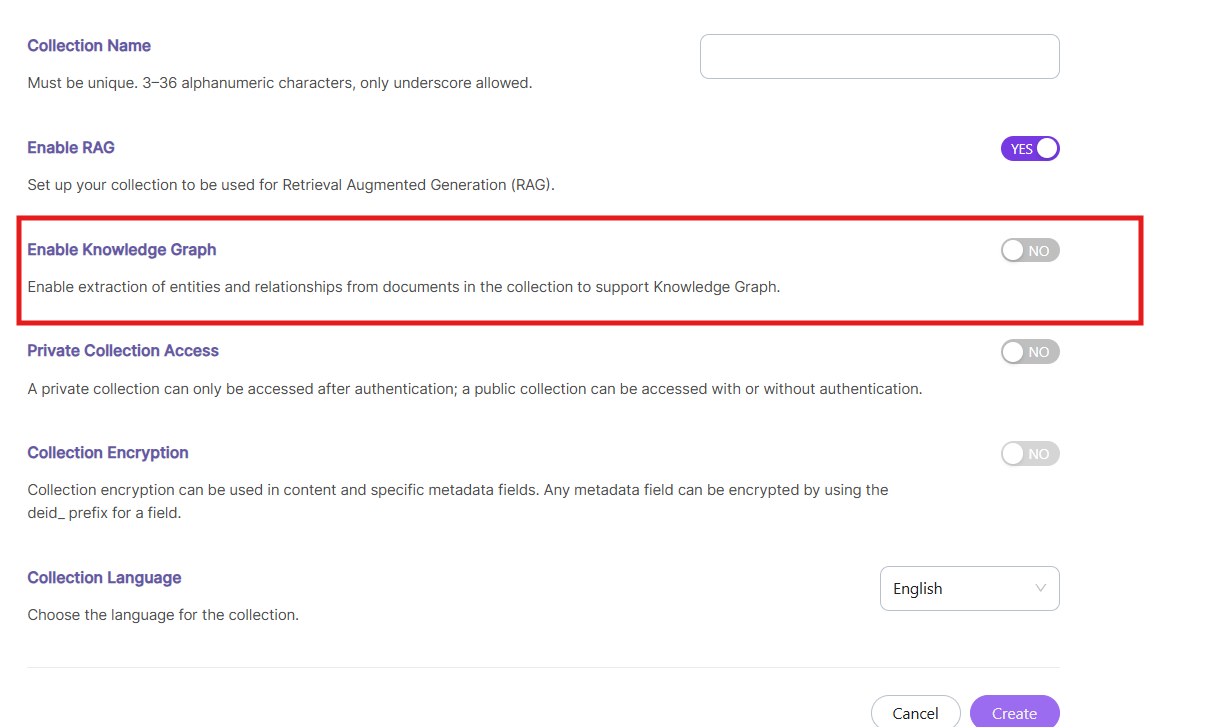 - Enabling Knowledge Graph may increase indexing time due to entity extraction