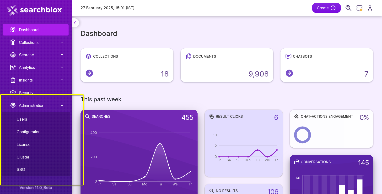 Using the Administration section you can manage the license, create and manage different user accounts, backup and restore SearchBlox configurations and set up cluster.
