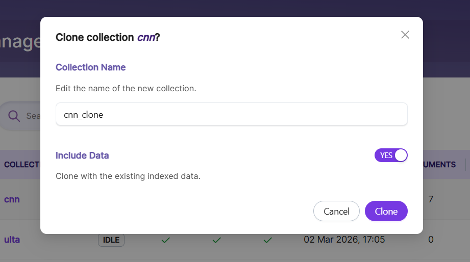 Cloning allows you to quickly create a new collection by copying the settings—and optionally the data—of an existing collection.