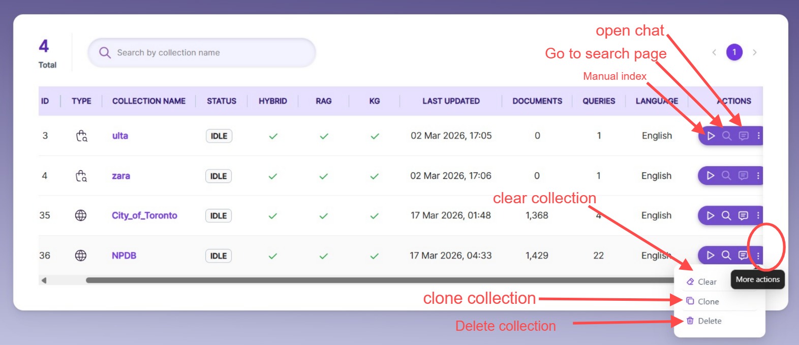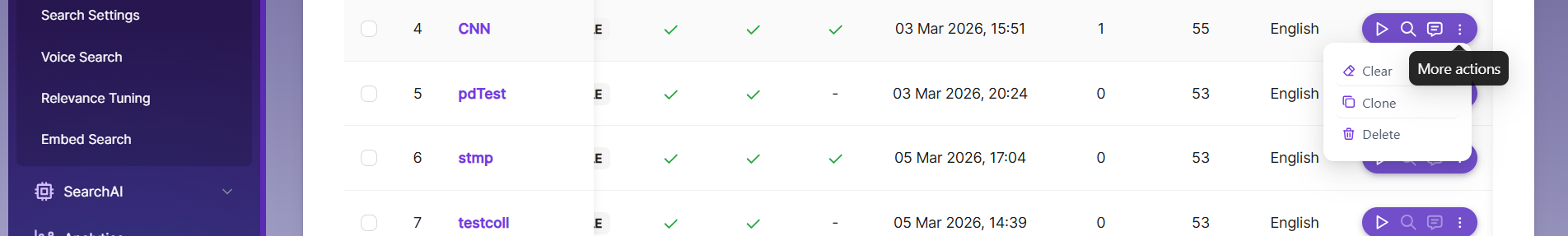 - Actions (Possible actions that can be performed such as index, refresh, clear, configure collection, search, delete and clone)