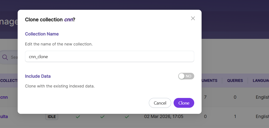 - Enter a new collection name in the popup. Choose whether to include data (documents) or clone only the settings, then click the Clone button.