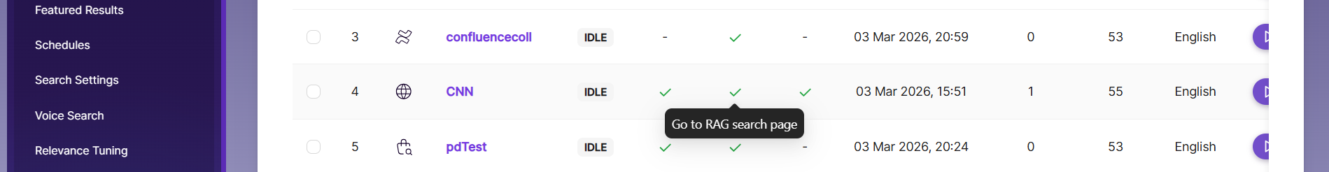 When RAG is enabled, hovering over the RAG label for any collection shows a tooltip called “Go to RAG search page.” as shown below: