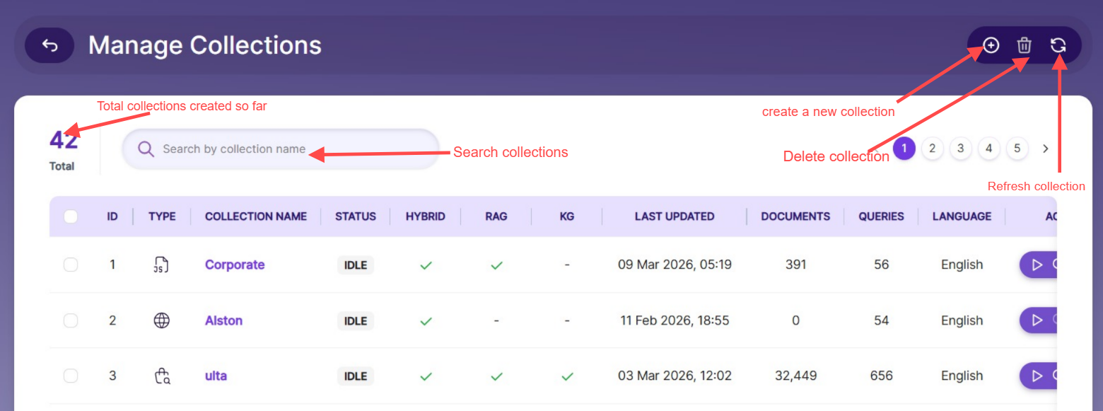 The Collections section supports many actions such as creating, editing, refreshing, deleting, indexing, clearing, cloning, filtering, and searching, allowing you to fully manage all aspects of a collection.