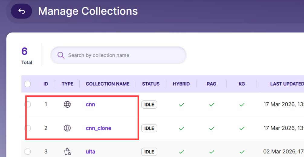 | Clone Collection | Duplicate an existing collection using the Clone Collection icon. |